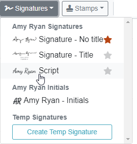 - Click the Signatures button to display a list of your saved signatures and initials. See Create your Signatures to learn how to create and manage your signatures.